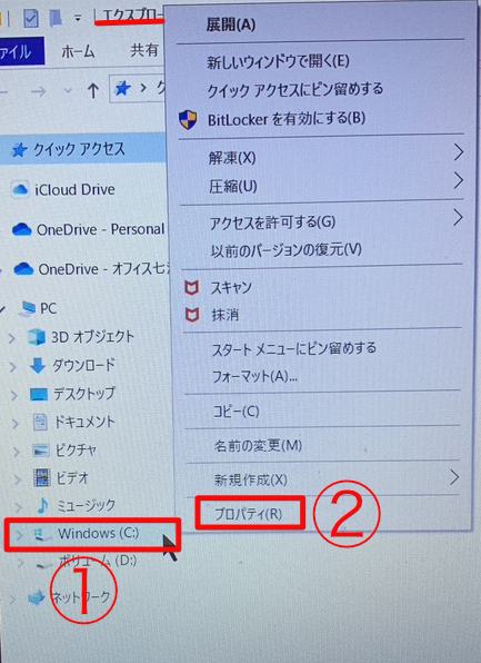 先程の、Cドライブを右クリックしてプロパティを開きます。
